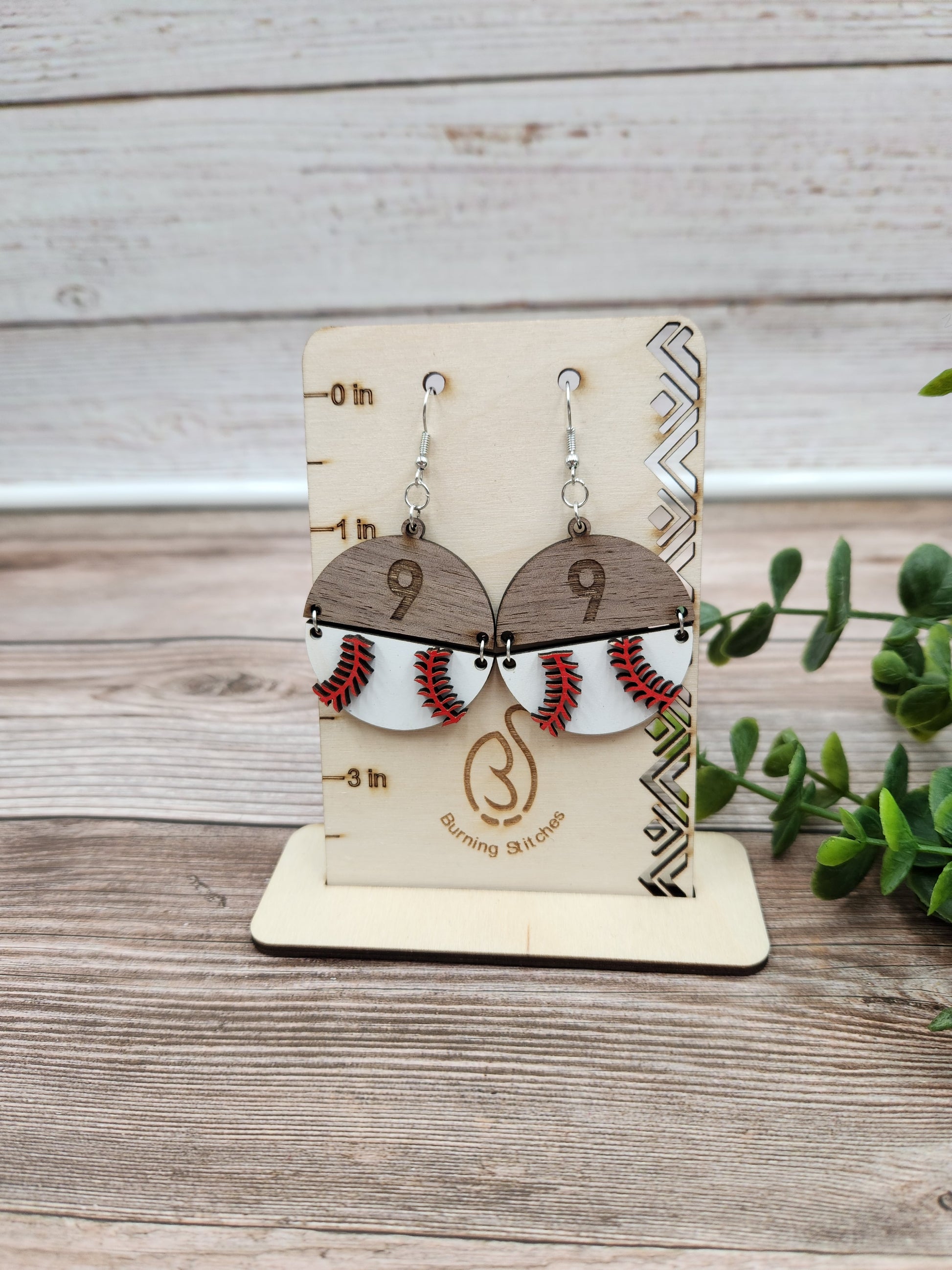 This multi-layered baseball earring is split to give a different look. The top portion can be customized with a number, player name or team name. They are made with hypoallergenic stainless steel hardware.