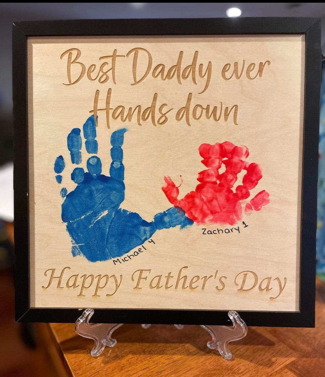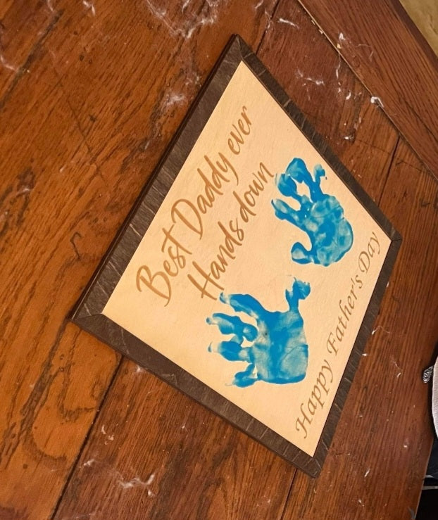 This Father's Day give a gift to treasure for years to come. Have your child put thier handprints on these signs to have as a keepsake. The name can be changed to Dad, Daddy, Papa ect...... Choose the color of the frame as well.