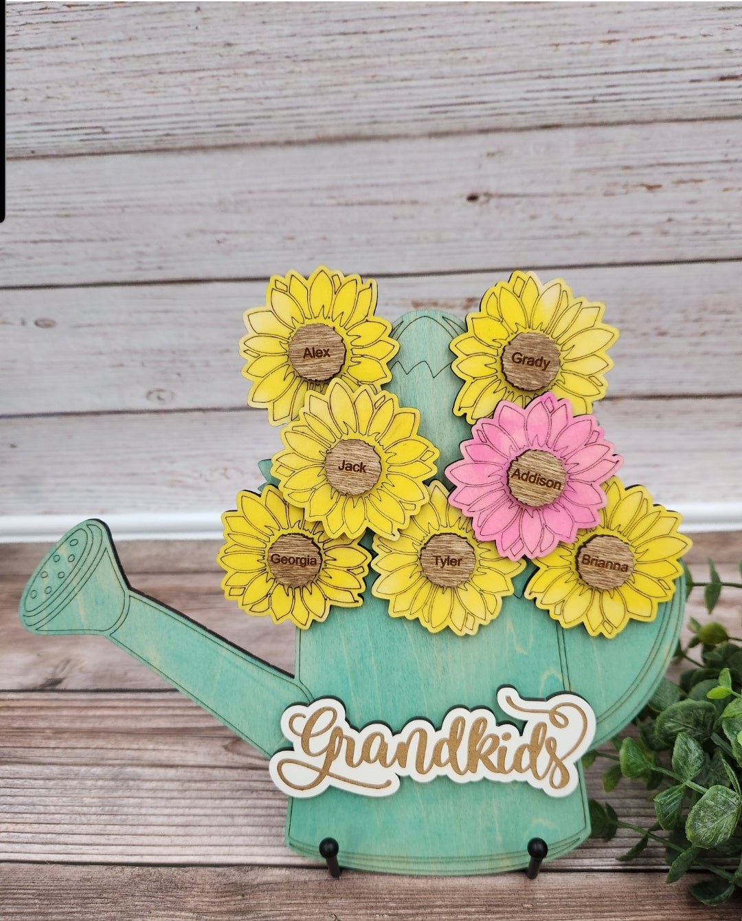 This charming, personalized watering can display brings a splash of joy and color to any grandparent's home. Perfect for welcoming spring, it features vibrant sunflowers, each lovingly inscribed with a grandchild's name, creating a garden of memories all year round.