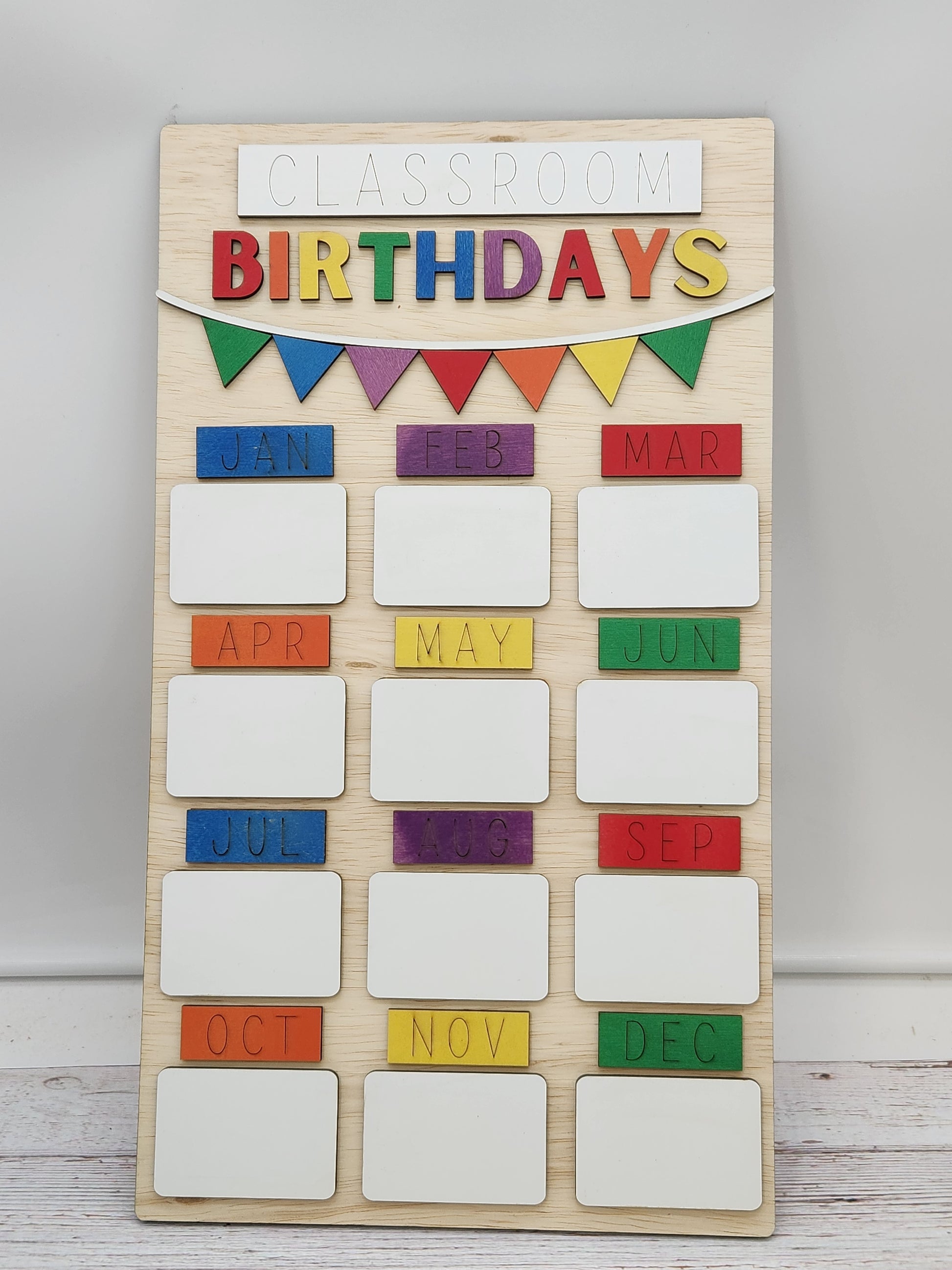 Keep track of your students' birthdays with this colorful Classroom Birthday Calendar! Perfect for any teacher's room, this wooden board features vibrant, color-coded month labels and spaces to add students' names. It's a fun and functional way to ensure every student's special day is remembered.