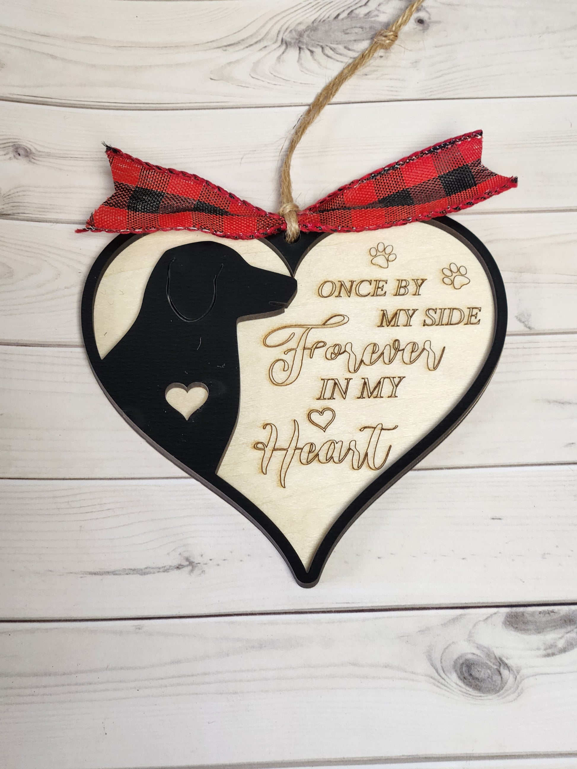 Dog memorial ornament made of wood, laser engraved, two layers with bow and string. Measures approximately 4"