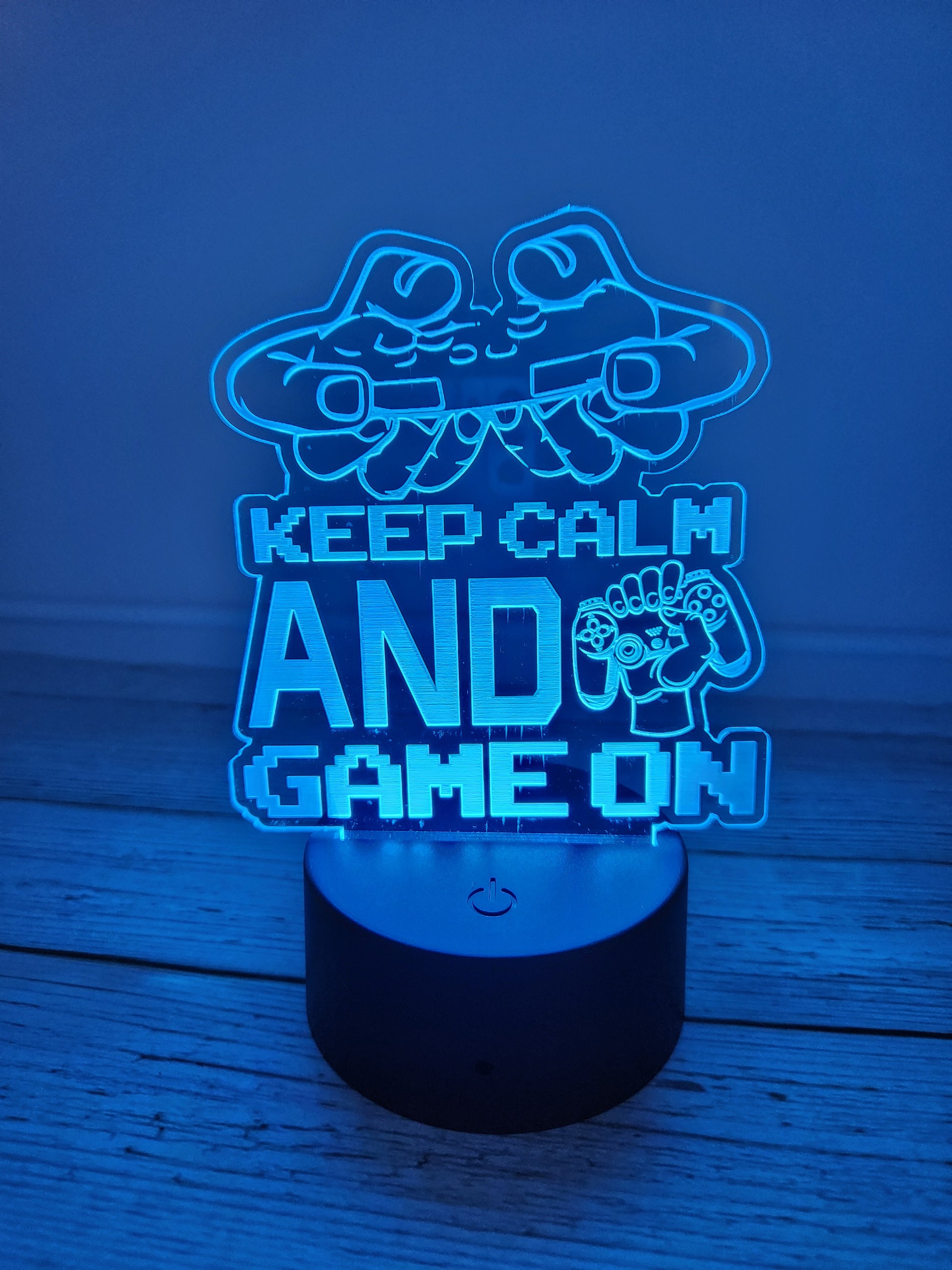 Level up your room's ambiance with this radiant LED decor lamp, designed for the ultimate gamer. With its catchy mantra 'KEEP CALM AND GAME ON', it's the perfect beacon for late-night gaming sessions or a stylish decoration for your streaming setup. Comes with a remote to controll 16 different colors as well as an USB cord. Batteries NOT included.