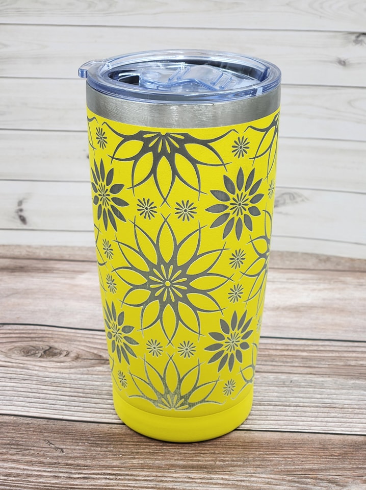 This tumbler is a stainless steel skinny tumbler with lid, 20oz Double wall vacuum insulated travel mug, reusable water, coffee cup for cold/hot drinks, laser engraved design. It's cold up to 9 hrs and hot up to 4 hrs. The brand of cup may vary depending on the current inventory.