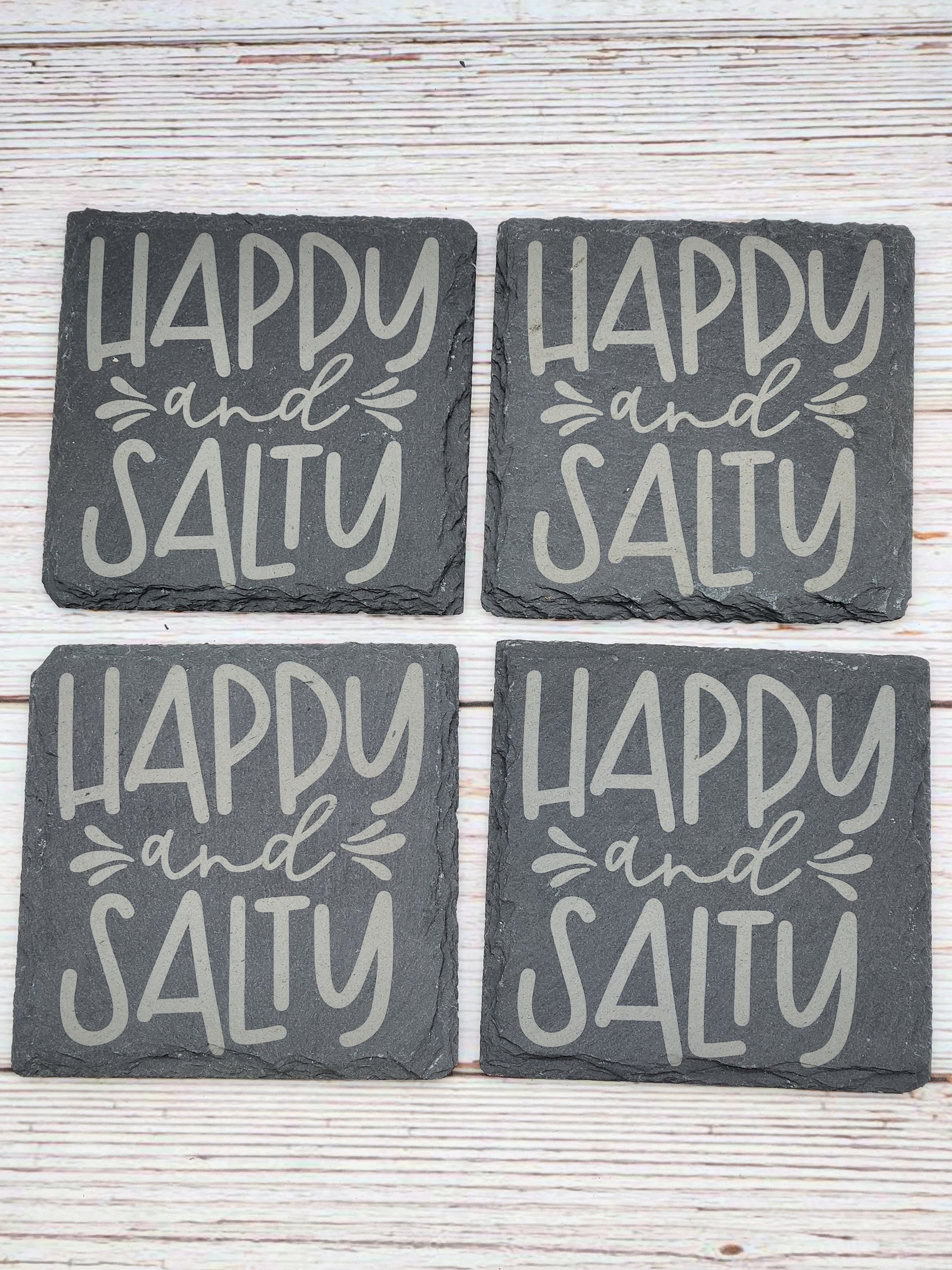 Add a dash of humor to your coastal collection with the "Seaside Smirk Coasters." These slate coasters, engraved with "HAPPY and SALTY," blend the carefree joy of seaside living with a playful twist. Perfect for those who love the ocean's breeze and don't mind a bit of cheeky fun, these coasters are sure to protect surfaces while provoking smiles and laughter.