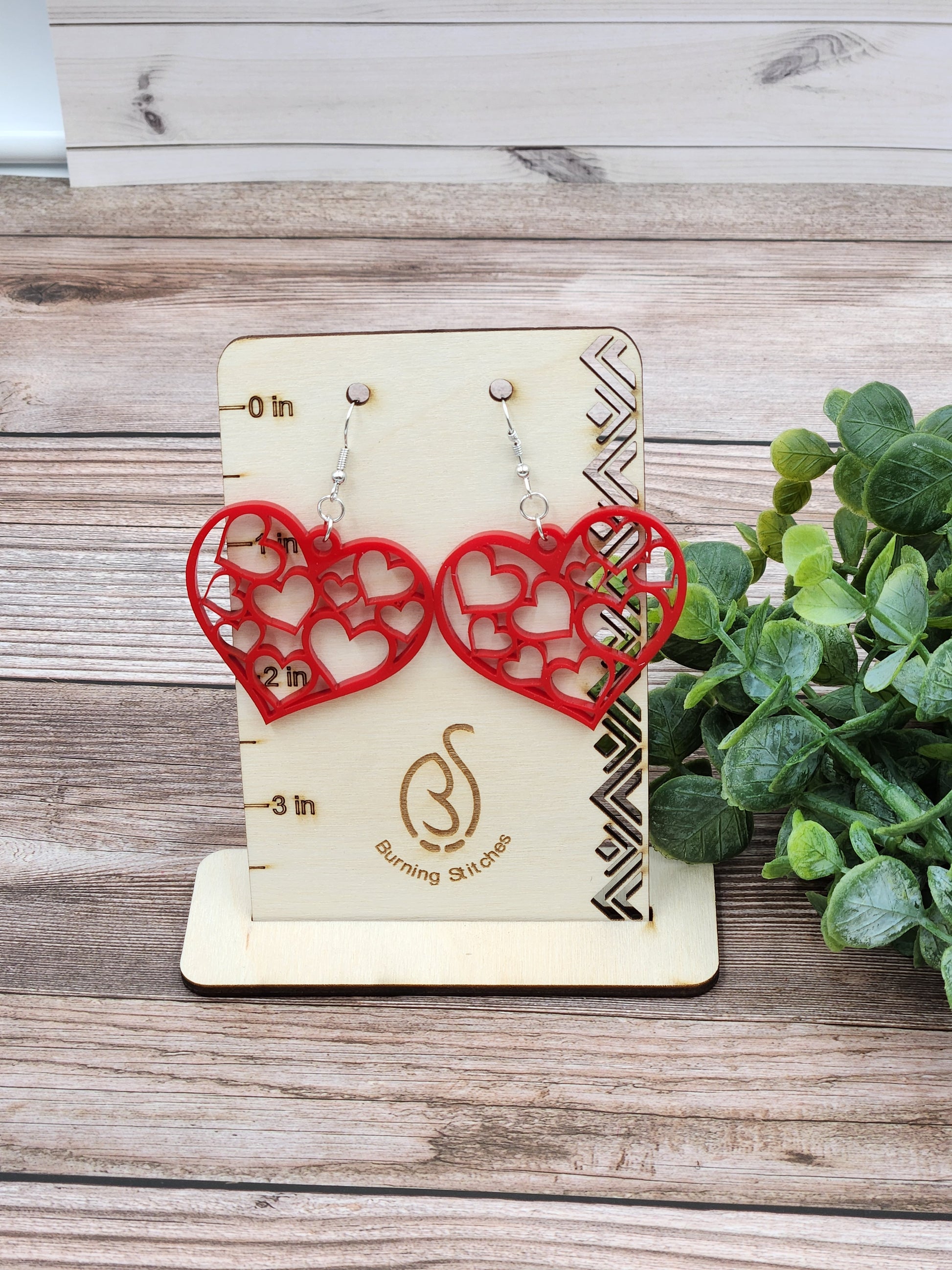 These hearts in heart earrings are perfect for Valentines Day. Made of solid red acrylic, hypoallergenic stainless steel hardware.