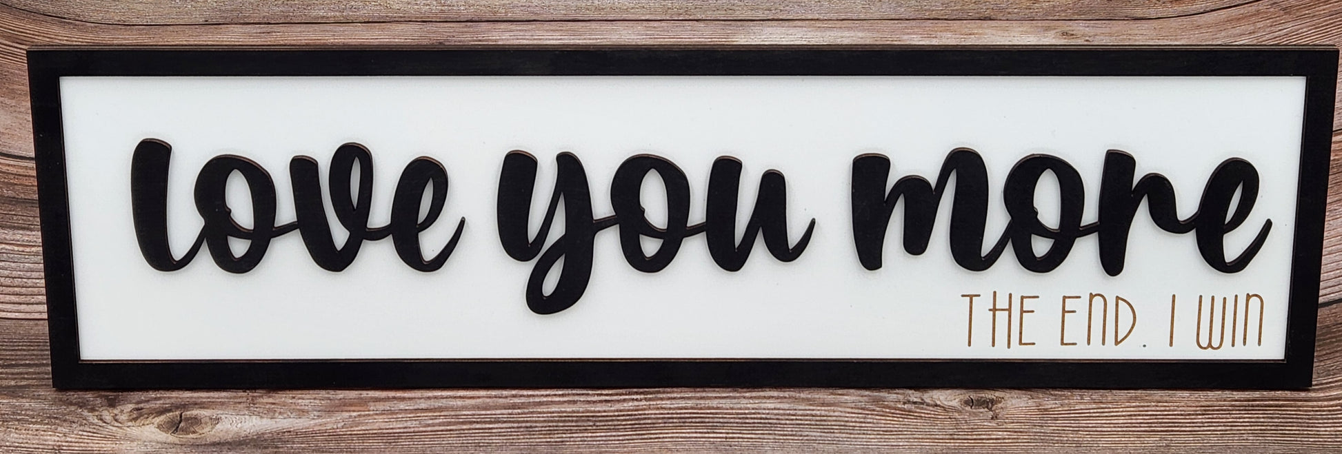 Love you more, is great for any occassion. Made of 1/8" thick Baltic Birch, 2nd layer is the frame and wording. Handpainted. Perfect for any mantle, table or kitchen counter. Measures 18.5"x5".