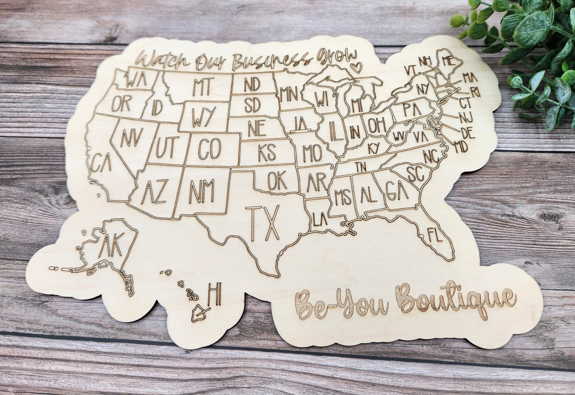 Watch your business grow with shipping across the US. Color in the states as you ship out to each one. Year after year get a new map to see you expand your reach. Customized with your business name on the bottom right side. Measures approximately 12x9. 1/8" Basswood material, laser engraved and outlined.