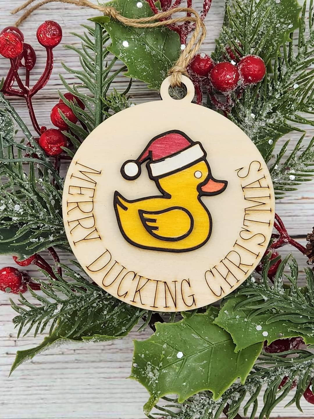 Add a touch of humor and charm to your holiday decor with this adorable Merry Ducking Christmas ornament. Featuring a cute duck in a Santa hat, this ornament is perfect for bringing festive cheer and a smile to your holiday celebrations.