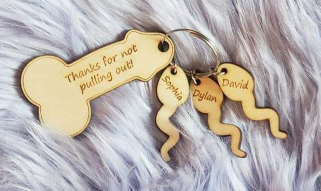 Thanks for not pulling out keychain is perfect for the guy in y our life with a sense of humor. Add up to 3 sperms. 4+ is additional charge.