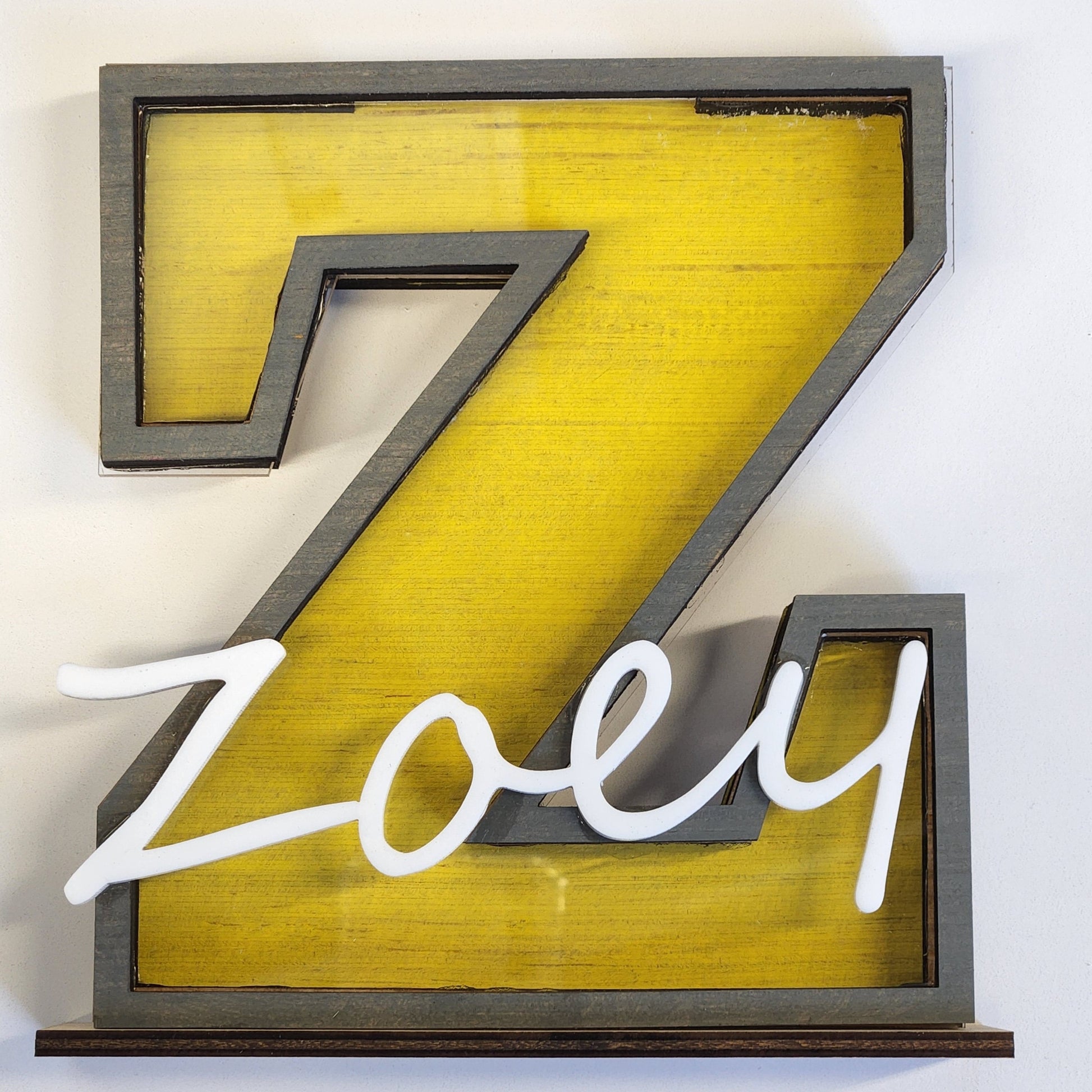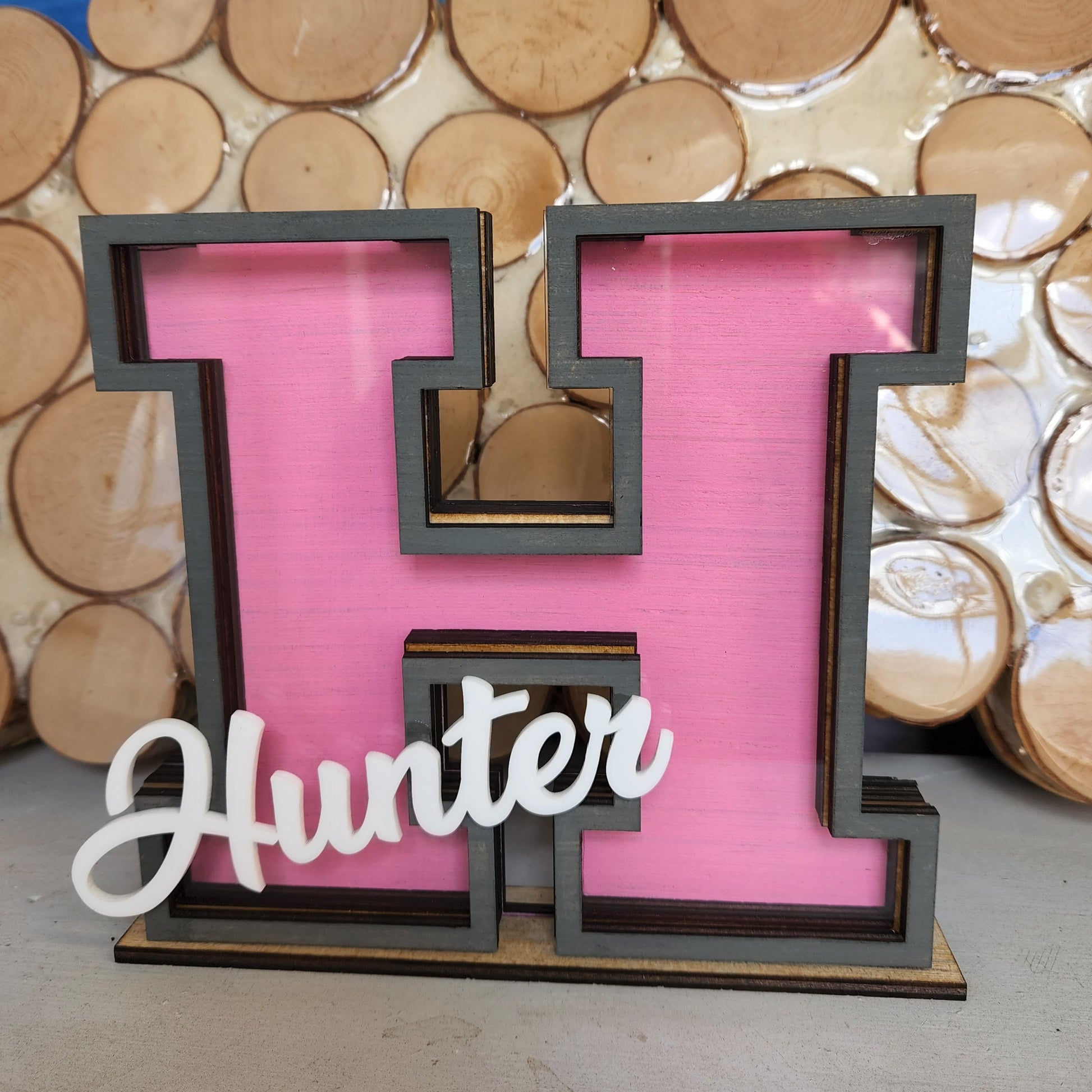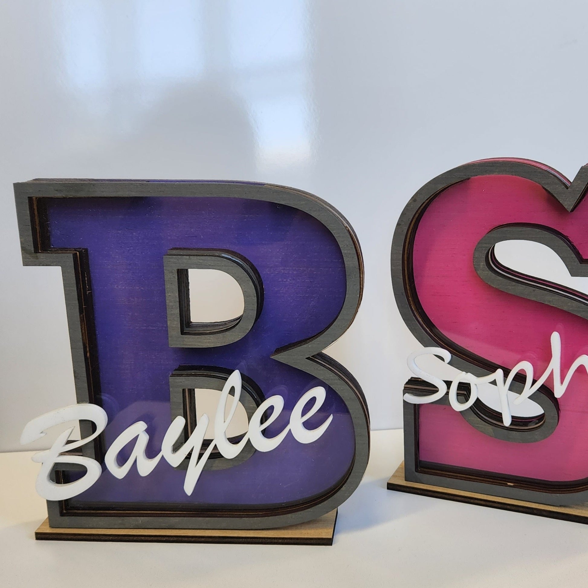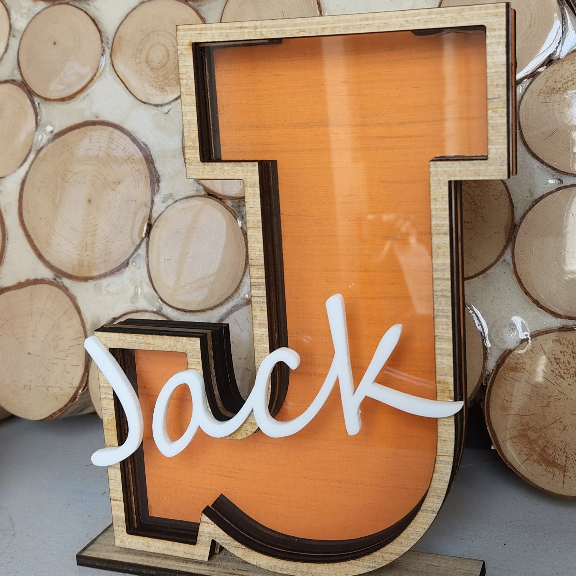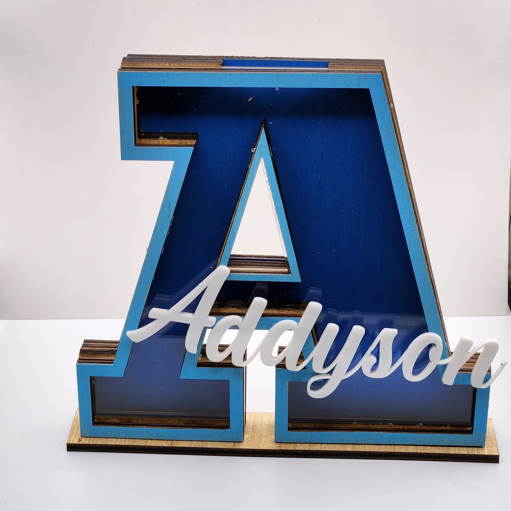 This Piggy Bank is made of laser cut 1/4" plywood and acrylic. Pick any two colors or go natural. All Alphabetical letters are available. The opening at the top is 1/2" wide. The average size of the bank is 8x8 inches. There is a layer of clear acrylic at the front of the bank. A name can be added for additional charge.