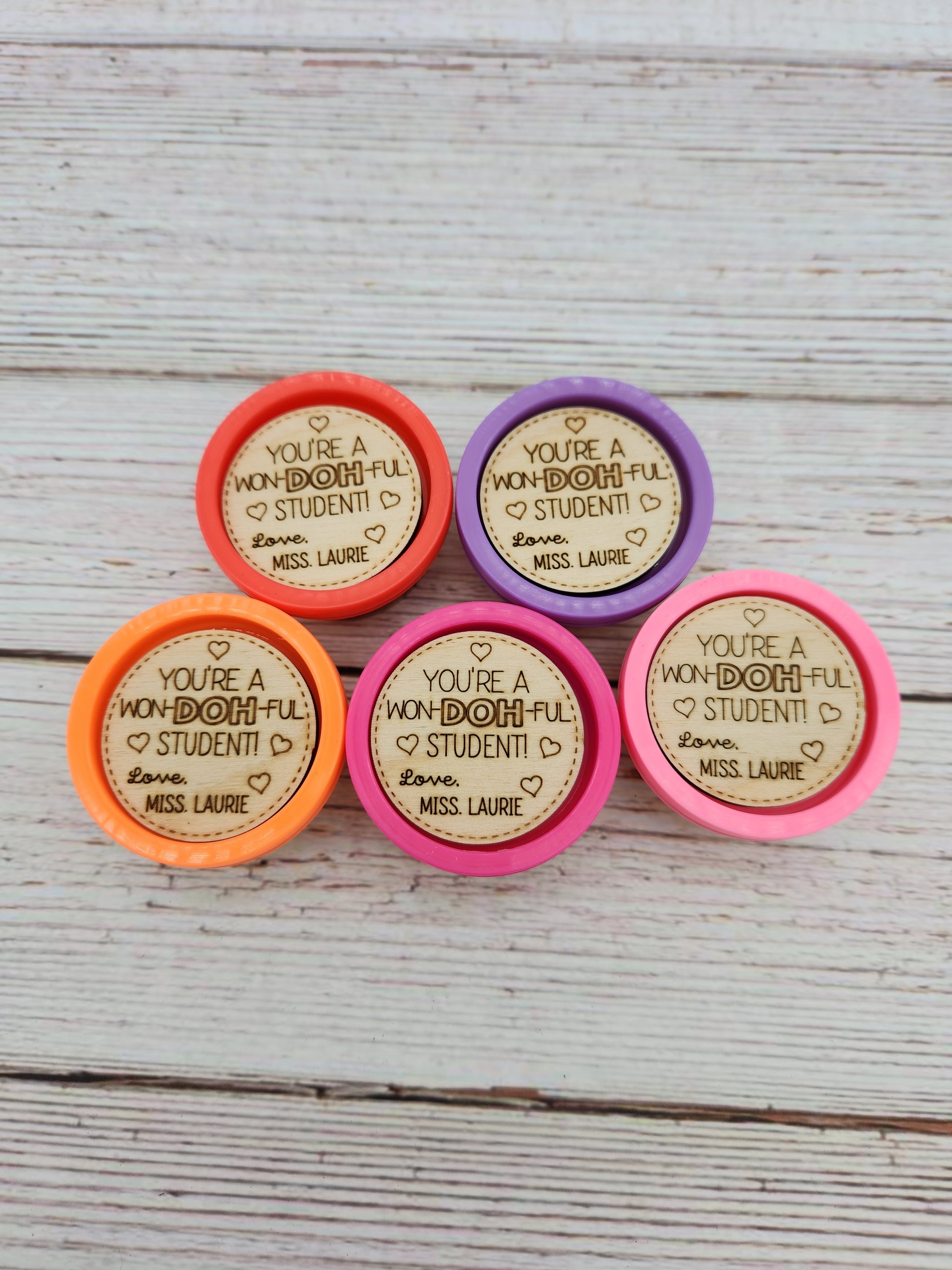 Grab these 1oz colored dough containers for your child's class this Valentine's Day. The wooden circle insert can be customized with your child's name. Or who it's "From". Option is available to come with dough