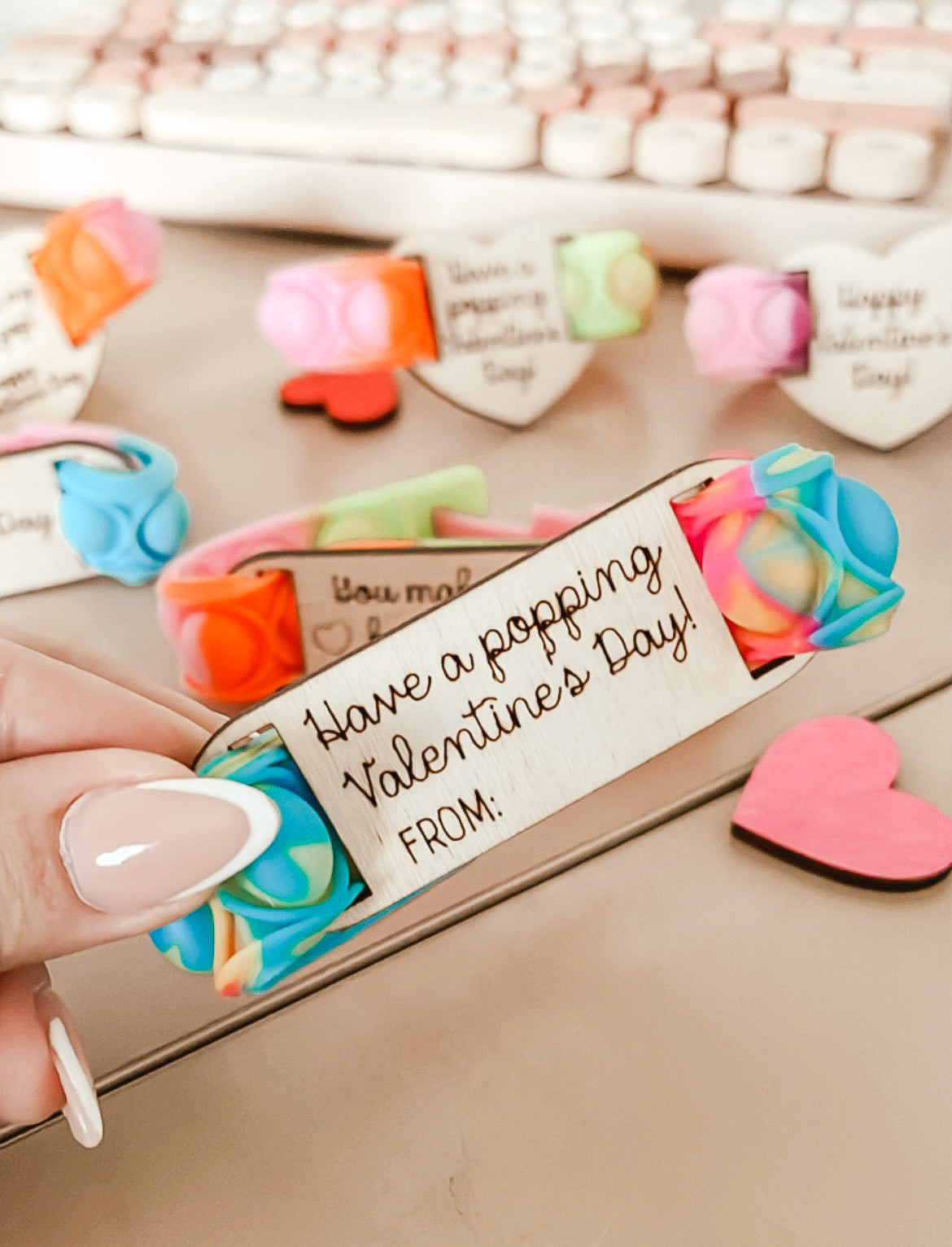 Pop-it Braclets make a great Valentine for any kid. These can be customized with your childs name or can be blank.
