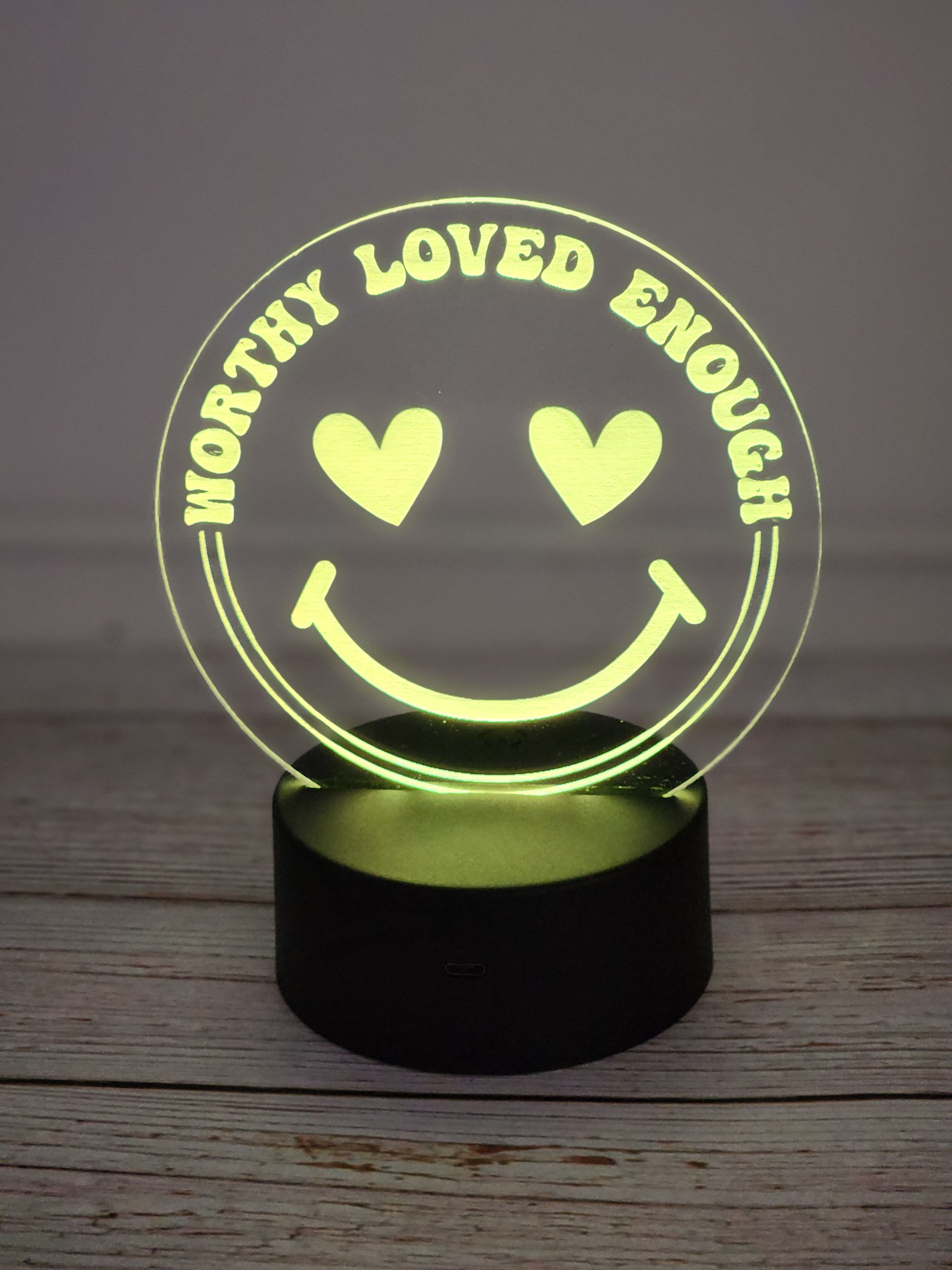 Fill your room with positivity and light with this Affirmation LED Lamp. The soft, calming glow emits not just light but a message that reminds you daily: you are "Worthy, Loved, Enough". With its cheerful smiley and heart symbols, this lamp is more than a light source; it's a daily affirmation of self-love and acceptance. Perfect for a gift to a loved one or a personal treat to brighten your space and your spirits. Comes with a remote to control 16 different colors and USB cord. Does NOT include batteries.