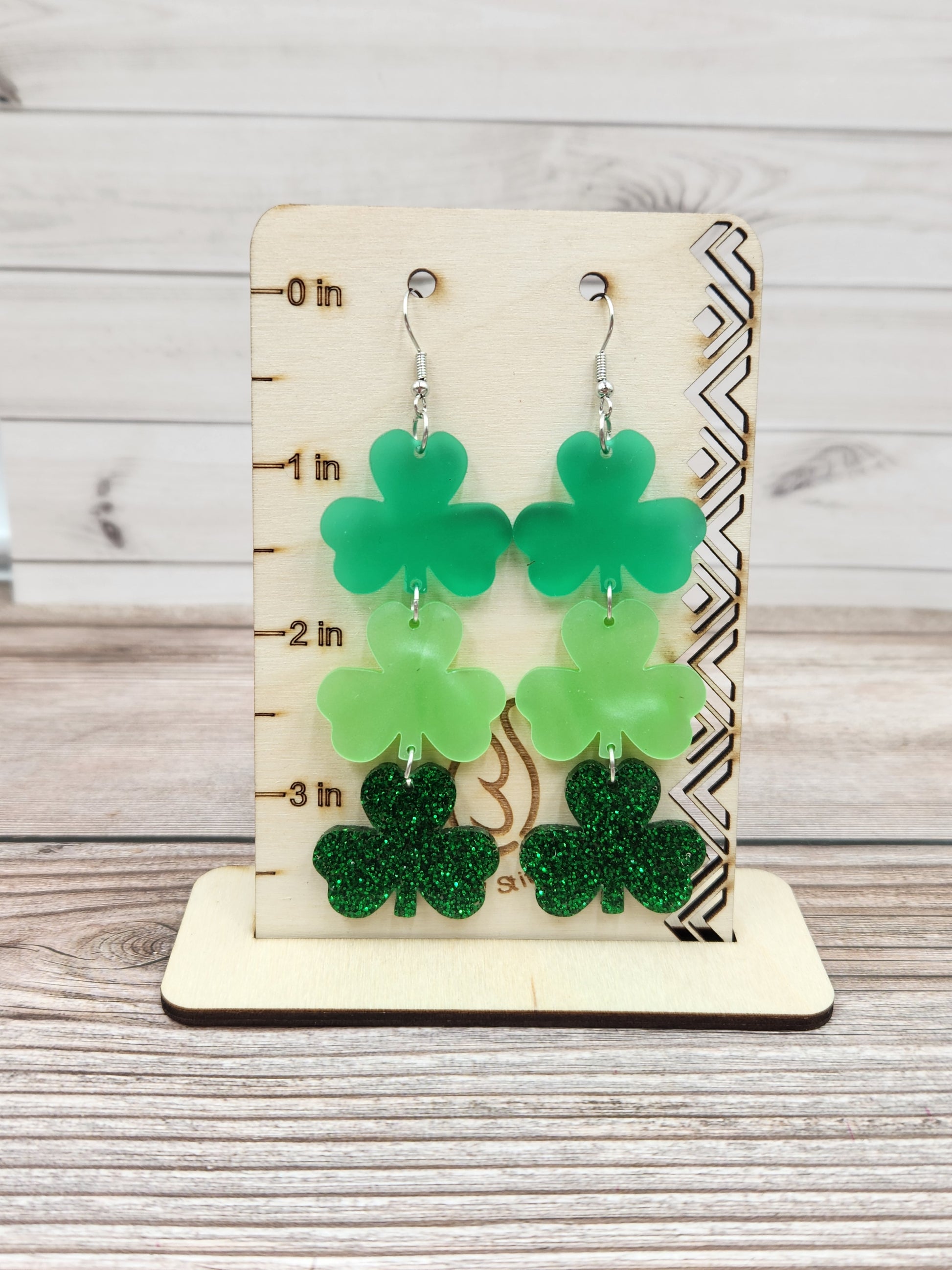 These gorgeous 3 stacked shamrock dangles are laser cut acrylic. Frosted green, key lime swirl and glitter green. Hypoallergenic stainless steel hardware. Lightweight.