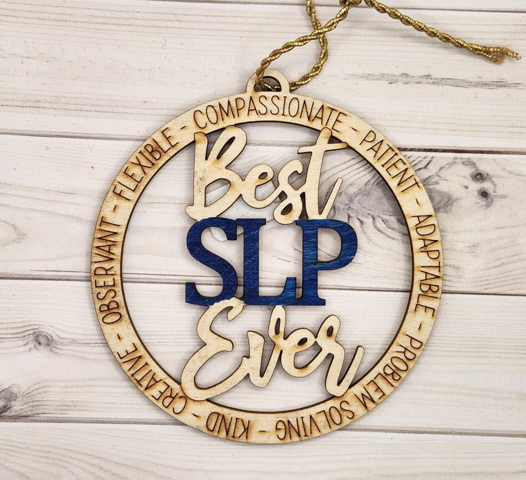 Speech Language Pathologist ornament. Measures approximately 3.25". Colors and string may vary.