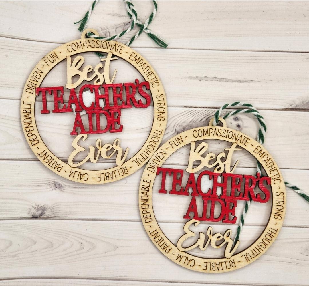 Teacher Aide Ornament laser cut. Measures approximately 3.25". Color and string may vary.