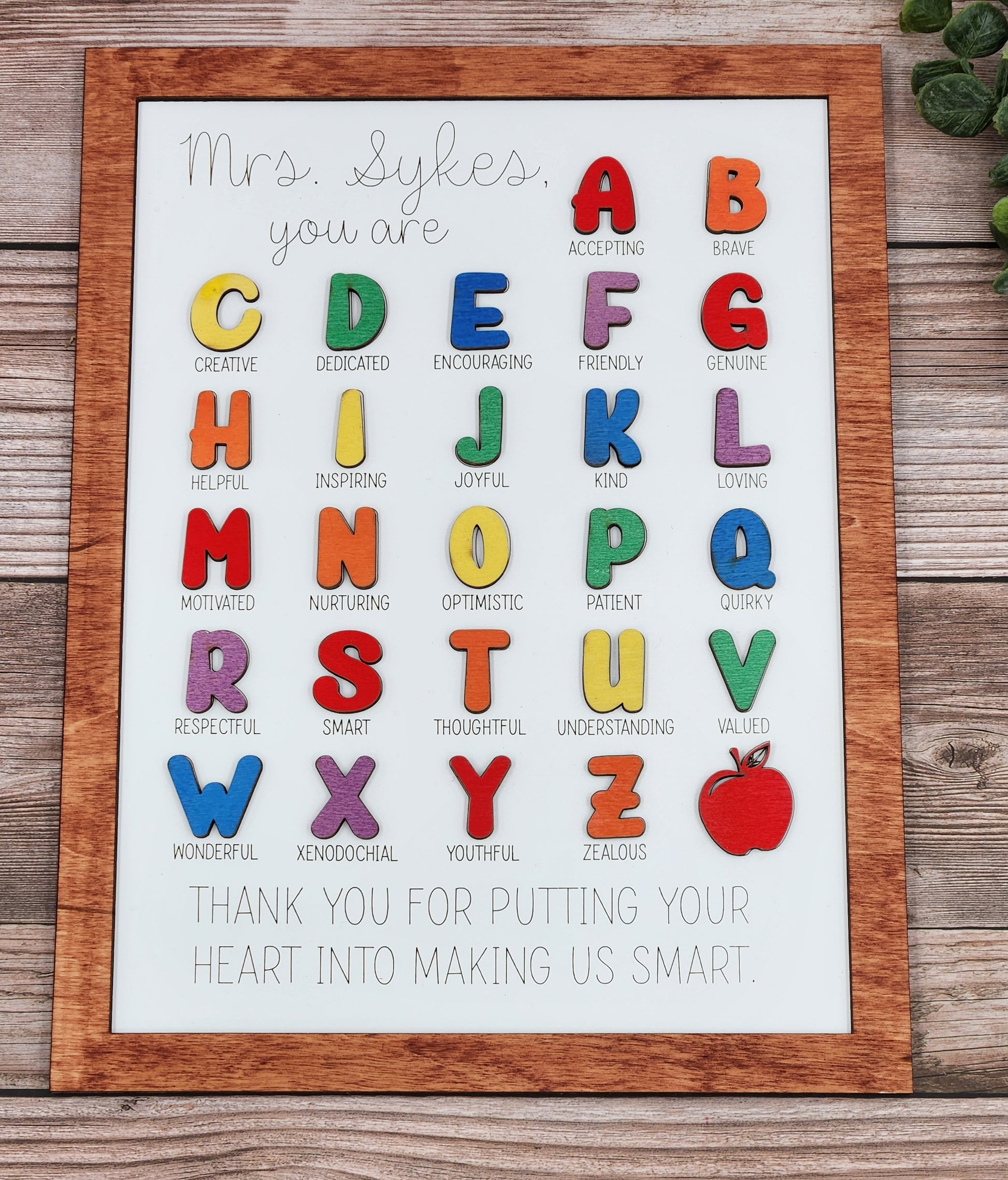 Teacher alphabet sign will make a unique gift for any teacher on your list. Made with 2 layers, faux frame, made as shelf sitter, comes with stand. Laser cut, hand painted. Can be customized with teachers name. Measures 8x10