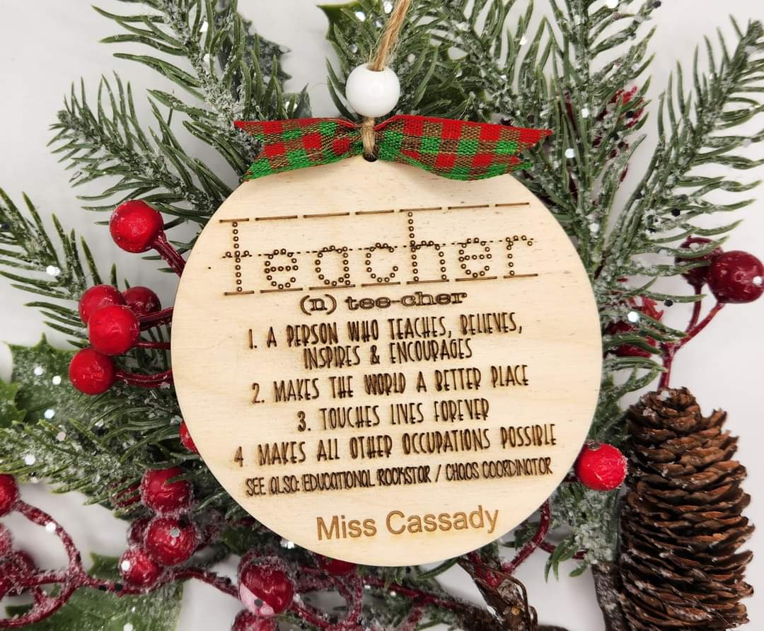 Teacher definition ornament. Measures 3.25, string, beads & ribbon may vary.