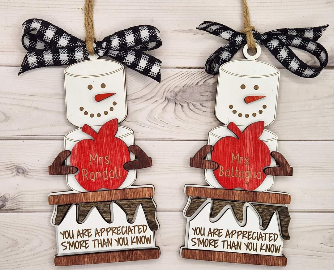 Teacher S'More Ornament. Measures approximately 4.25" tall. String, ribbon and color shades may vary. Apple can be customized with teacher's name.