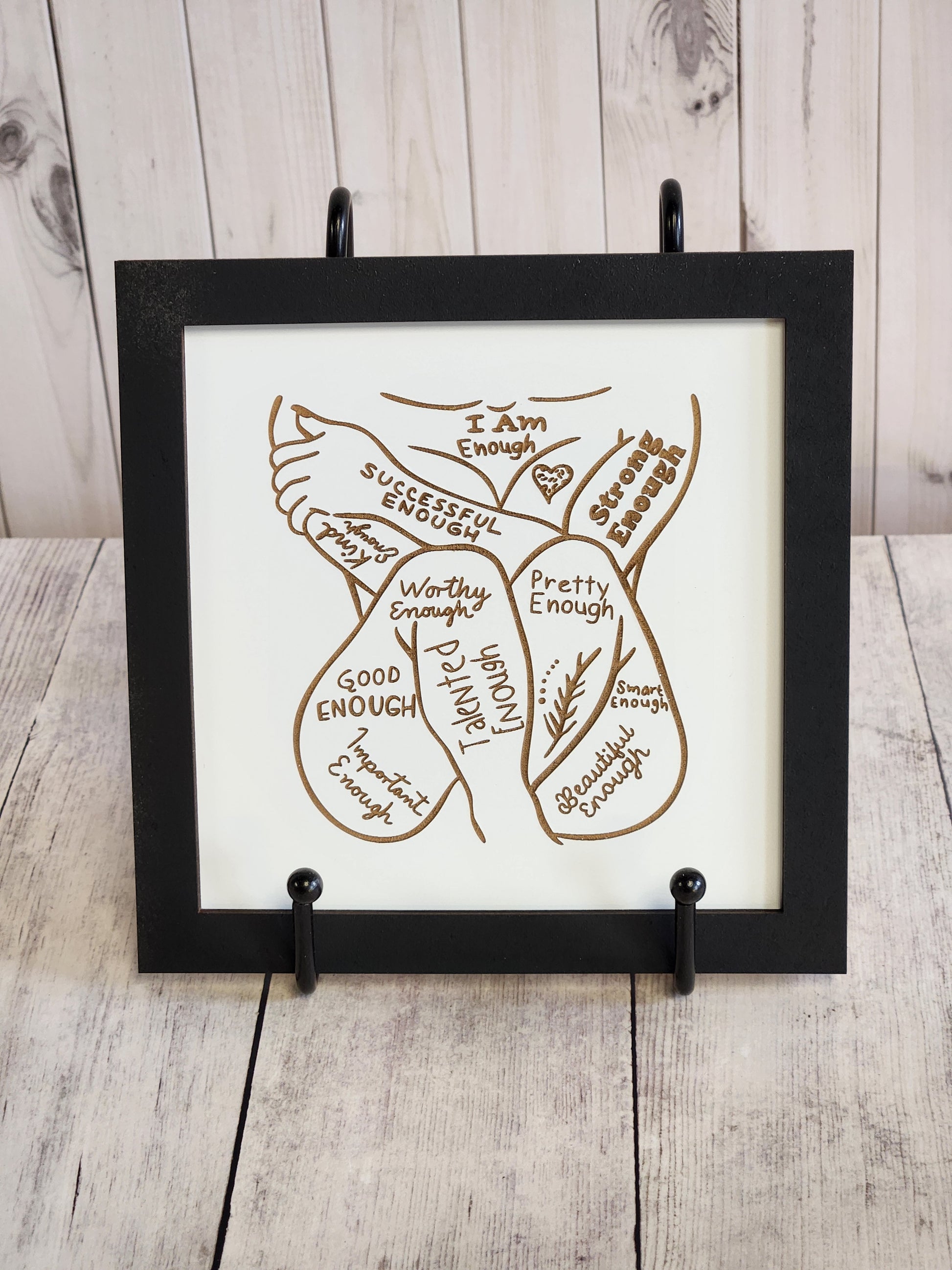 A 5x5 "I am enough" sign designed to convey self-affirmation and self-worth. It's a positive reminder to oneself that they are sufficient just as they are. This is laser engraved material with a faux frame. Stand not included.