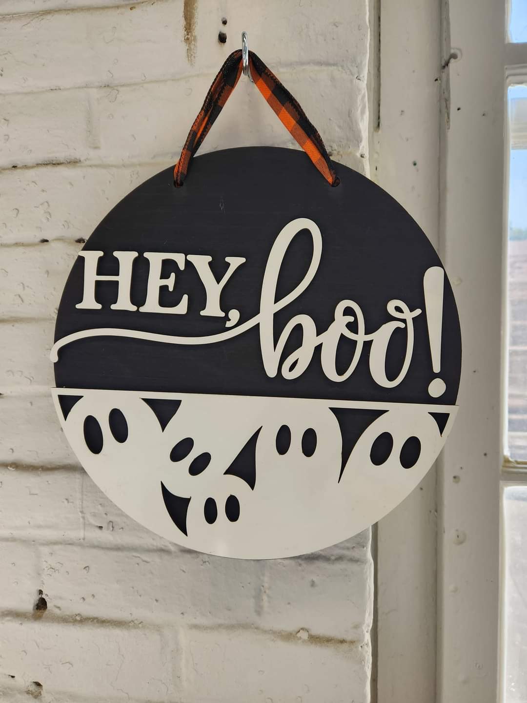 'Hey Boo' door sign Measures 14", made of wood and handpainted. Sealed with Thompson WaterSeal, however not recommended for direct exposure to outdoor elements.