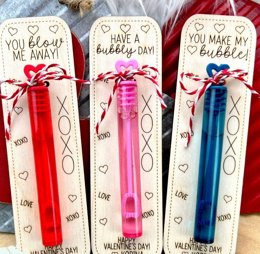 Grab a Valentine Bubble Wand for the kids classroom this year. Option to include bubbles available. Wooden piece can be customized with child's name. Bubble wand colors are random if purchasing with bubbles.